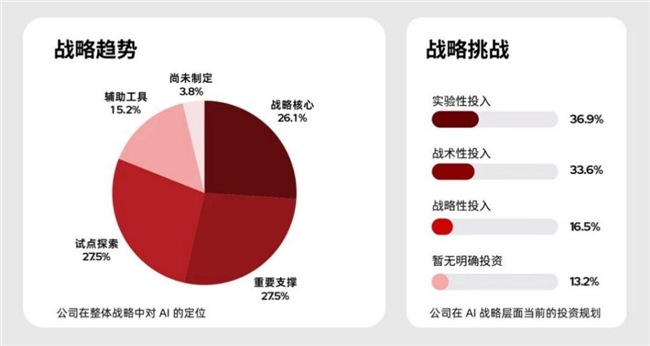 报告深刻指出,2025 年是中国企业 AI 应用迈向规模化落地的关键转折点。企业对 AI 的认知已从前沿技术转变为战略核心,AI 的价值不再局限于局部优化,而是全方位重塑企业竞争力。报告中的“三分格局”揭示了企业 AI 战略成熟度的差异,既有将 AI 视为战略核心的先锋企业,也有处于试点探索阶段的观望者,更有将其仅视为辅助工具的保守派。这种多元化的战略定位,凸显了企业在 AI 赛道上的分化态势。