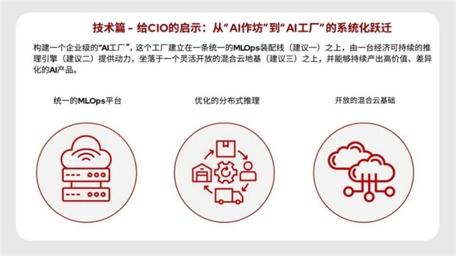 此外,报告针对AI应用落地过程中的技术瓶颈提出了切实可行的解决方案。如在AI基础架构领域,混合云模式成为主流选择,企业通过混合云架构平衡了成本、安全与敏捷性;在AI平台建设方面,企业亟待打破技术孤岛,构建统一的MLOps平台,实现AI开发流程的标准化与流水线化,基于云原生技术构建一个高度开放、模块化、服务化的平台,实现资源的弹性伸缩和跨环境的一致管理;在AI模型方面,掌握AI经济学,从“算力堆砌”转向“AI FinOps”的精细化运营思维,利用vLLM及llm-d等开源技术降低推理成本,最大化硬件利用率。这些技术层面的洞察与建议,为企业在AI技术应用中提供了明确的指导方向,助力企业提升技术应用效率,加速AI价值落地。